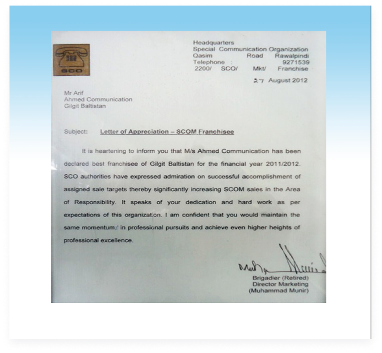 Franchise Award by the Sector Commander SCO Mr. Tahir Hussain for the year 2011-12. • A letter of appreciation